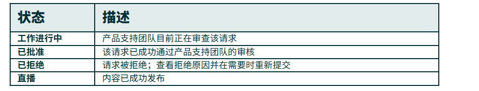 答案: 可以在上传自助内容门户中直接跟踪请求状态。可能的状态包括: